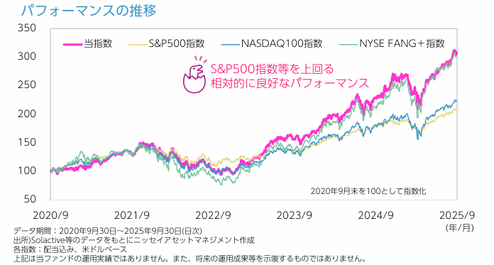 2020年9月を起点とした過去5年間の試算データ(2025年9月時点)です。メガ10はS&P500やナスダック100を大きく上回るリターンを示しています。